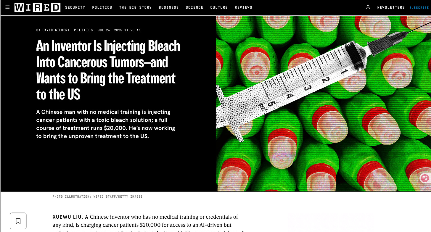 This article explores the controversial case of Xuewu Liu, a Chinese inventor promoting an intratumoral chlorine dioxide cancer therapy. While the story contains significant public health relevance, emotional resonance, and political timeliness, its current form does not meet WIRED’s standards for scientific integrity, evidentiary balance, legal safety, or ethical neutrality.